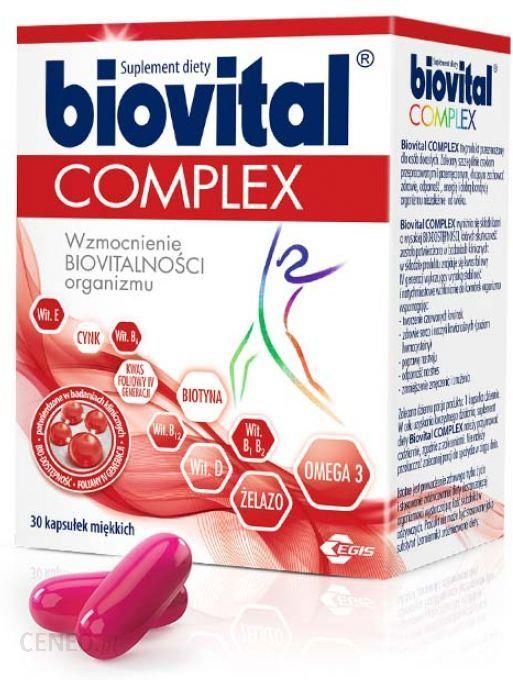 Biovital Complex to bogactwo witamin i minerałów oraz kwasów omega-3. Suplement diety przeznaczony jest dla osób po 40 roku życia, które chcą żyć pełnią życia, ciesząc się zdrowiem, energią i dobrą kondycję organizmu na długo. W składzie produktu znajdują się m.in. żelazo, kwas foliowy, cynk, selen, jod, witamina E, witamina D oraz witaminy z grupy B. Preparat jest w wygodnej do połknięcia formie kapsułek z płynem w środku, co pozwala na dobre przyswajanie składników odżywczych przez organizm.Zawarty w suplemencie diety Biovital Complex:kwas dokozaheksaenowy (DHA) należący do kwasów Omega-3 przyczynia się do utrzymania prawidłowego funkcjonowania mózgu oraz widzenia,żelazo pomaga w prawidłowym transporcie tlenu w organizmie oraz produkcji czerwonych krwinek i hemoglobiny,kwas foliowy IV generacji pomaga w utrzymaniu prawidłowych funkcji psychologicznych, bierze udział w procesie podziału komórek oraz pomaga w prawidłowej produkcji krwiżelazo w połączeniu z kwasem foliowym pomaga w prawidłowym funkcjonowaniu układu odpornościowego i przyczynia się do zmniejszenia uczucia zmęczenia i znużenia,witaminy i minerały pomogą uzupełnić codzienną dietę w składniki odżywcze.